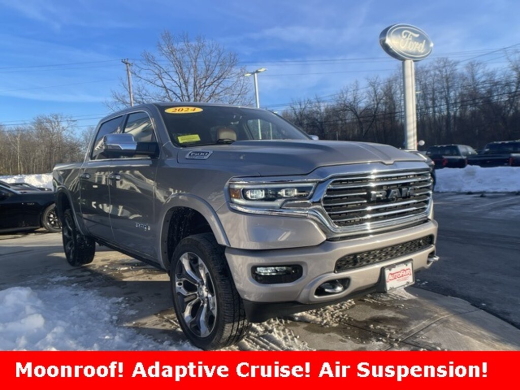 2024 Ram 1500 Laramie Longhorn Ford Blue Certified, 4WD, Rear Heated Seats, Navigation System, Heated & Cooled Seats, Heated Steering Wheel, Power Sunroof, Blind Spot Information System, Lane Keeping Assist, 1 Owner Clean Carfax, APPLE CAR PLAY ANDROID AUTO, 3.21 Rear Axle Ratio, 4-Corner Air Suspension, Adaptive Cruise Control w/Stop & Go, Alloy wheels, AM/FM radio: SiriusXM with 360L, Anti-Spin Differential Rear Axle, Apple CarPlay/Android Auto, Audio memory, Auto High-beam Headlights, Automatic temperature control, Blind Spot & Cross Path Detection, Body Color Bumper Group, Body Color Front Bumper, Body Color Rear Bumper w/Step Pads, Brake assist, Delay-off headlights, Digital Rearview Mirror, Dome Dual LED Reading Lamp, Driver Seat Memory, Dual-Pane Panoramic Sunroof, Electronic Stability Control, Exterior Mirrors w/Memory, Fog Lamps, Front dual zone A/C, Fully automatic headlights, harman/kardon 19 Speaker Premium Sound, Heads-Up Display, Heated door mirrors, Heated front seats, Heated rear seats, Heated Second Row Seats, Heated steering wheel, Lane Keep Assist, LED CHMSL Lamp, LED Dome/Reading Lamp, Longhorn Level 1 Equipment Group, Memory seat, MOPAR Spray In Bedliner, Outside temperature display, Panic alarm, Parallel & Perp Park Assist w/Stop, ParkSense Front/Rear Park Assist w/Stop, ParkView Rear Back-Up Camera, Pedal memory, Pedestrian Emergency Braking, Pick-Up Box Lighting, Power Running Boards, Quick Order Package 27K Longhorn, Radio data system, Radio: Uconnect 5 Nav w/12.0" Display, Rain sensing wipers, Rear window defroster, Security system, Surround View Camera System, Trailer Brake Control, Trailer Light Check, Trailer Reverse Steering Control, Trailer Tire Pressure Monitoring System, Trailer Tow Group, Variably intermittent wipers, Ventilated Front Seats, Ventilated Rear Seats, Wheels: 20" x 9" Aluminum Painted/Polished, Wheels: 22" x 9" Polish/Painted w/Inserts, Wireless Charging Pad.