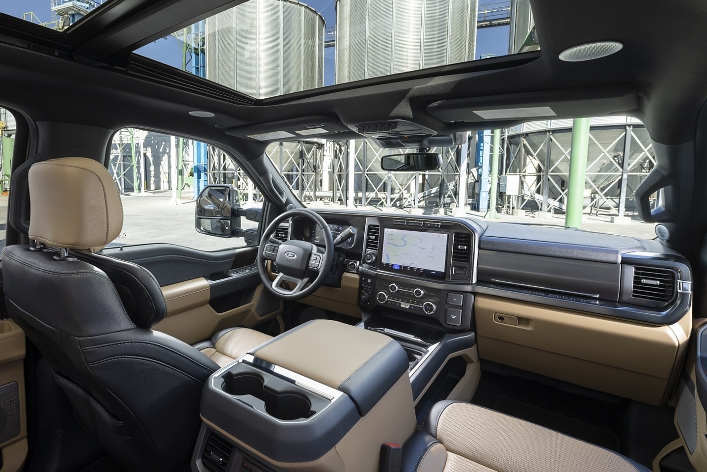 A newly redesigned interior for 2023, Super Duty® trucks deliver uncompromising comfort and amenities. Both driver and passenger will be greeted with stylish features to make your time spent inside enjoyable and relaxing. Available front leather-trimmed seats, stylish wood grain appliques, colorful 12-inch display screen and an available twin-panel moon roof. Plus, copious amounts of leg-and-head room offer ultimate refinement to Super Duty. ®